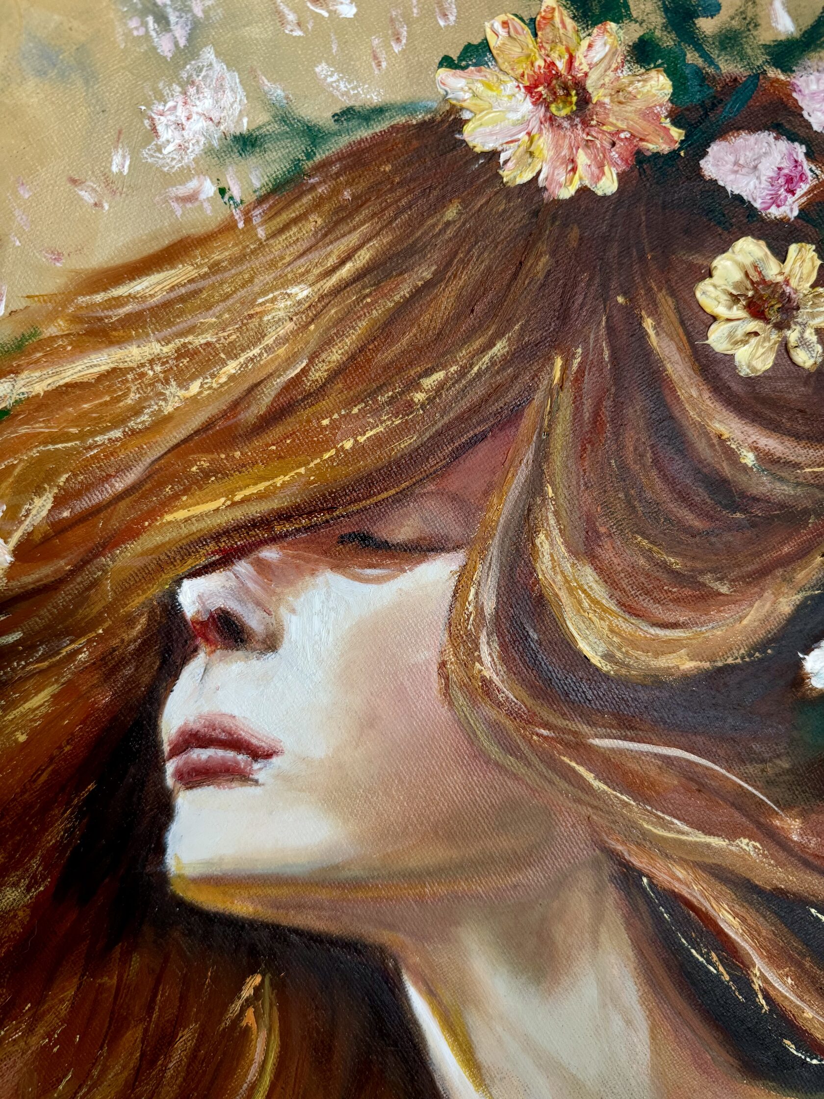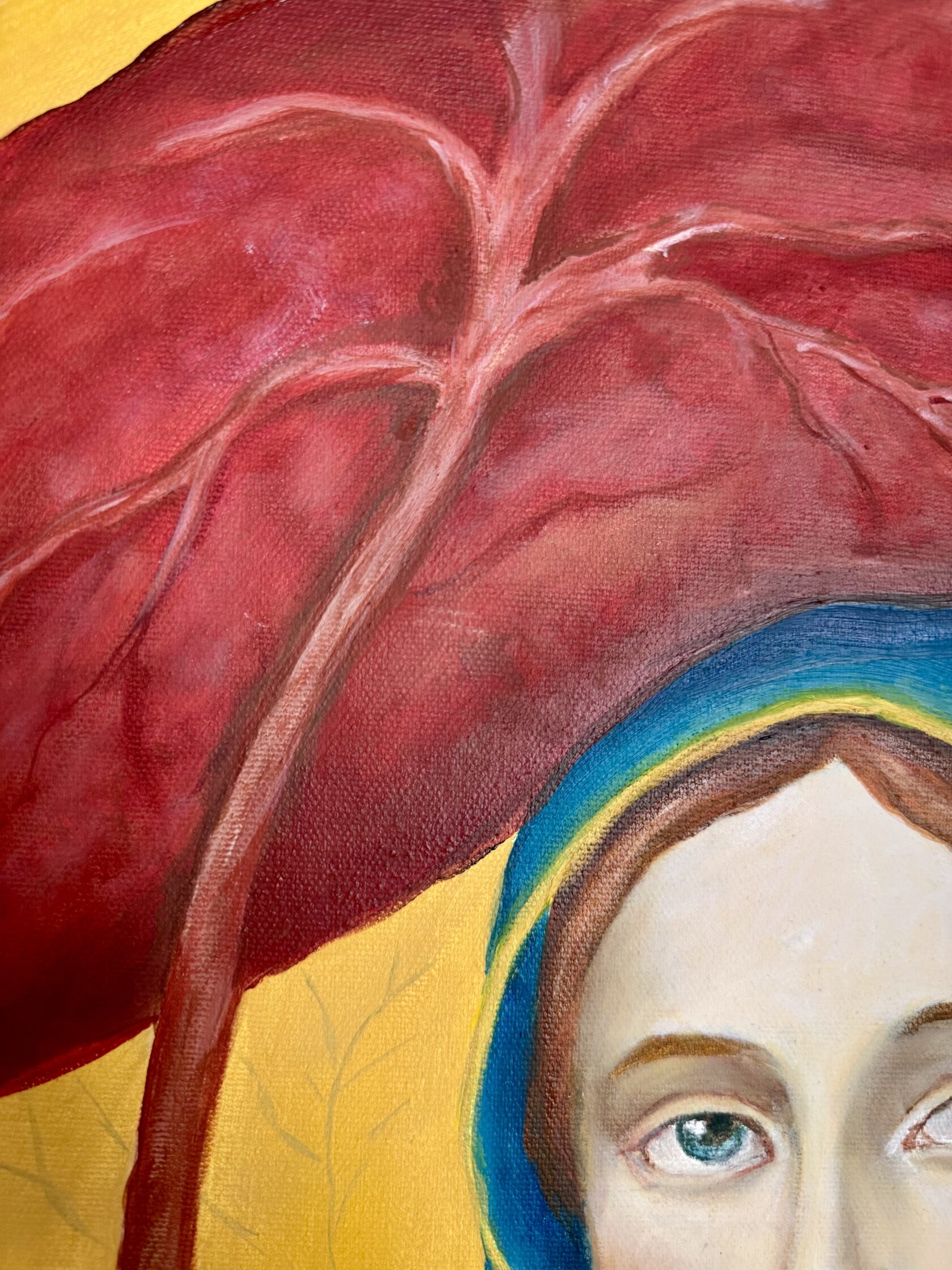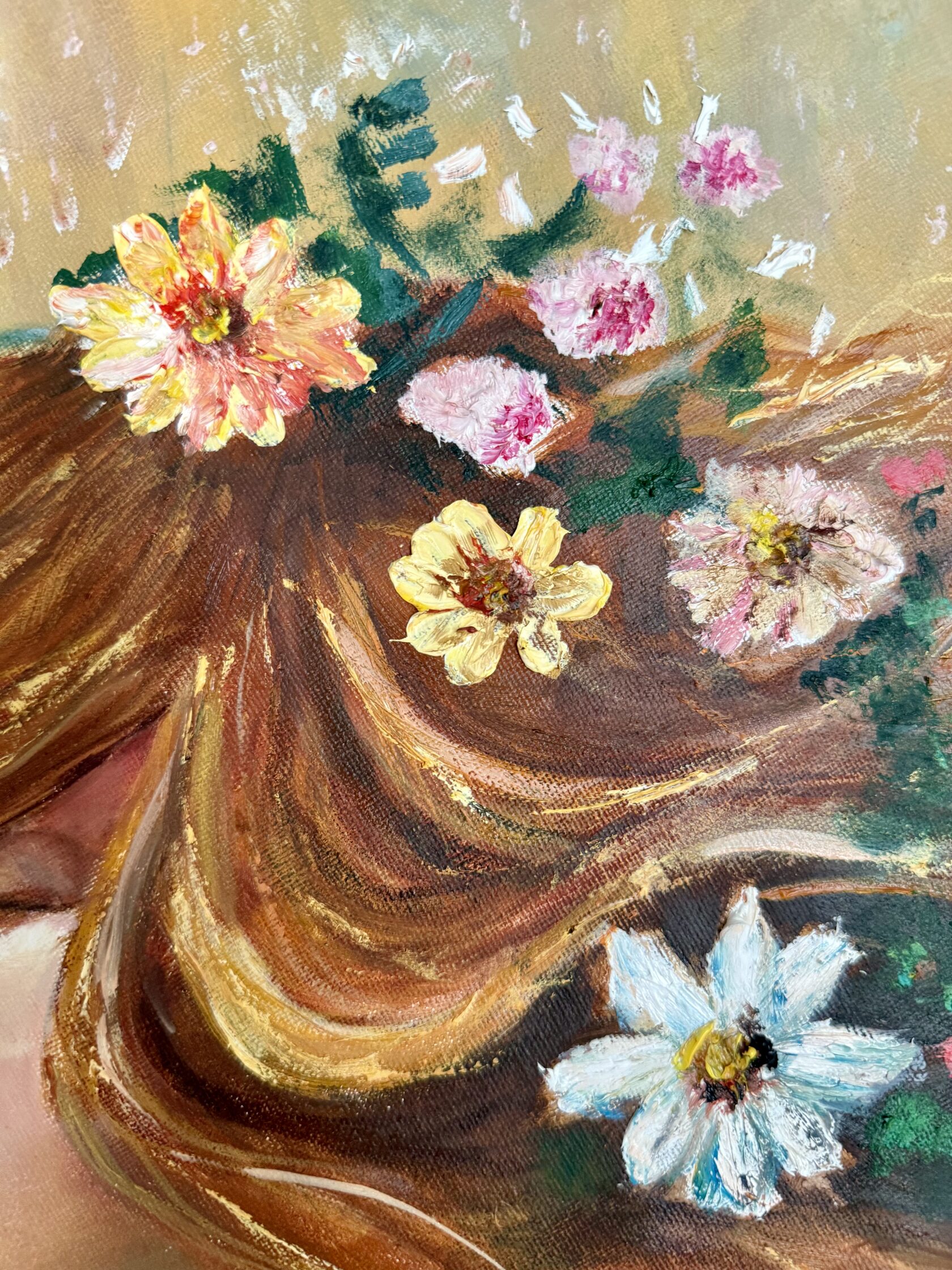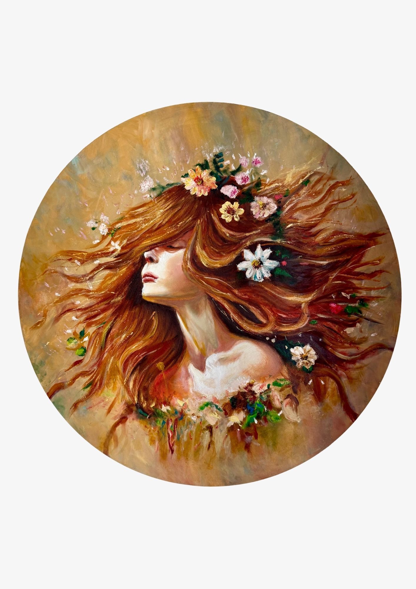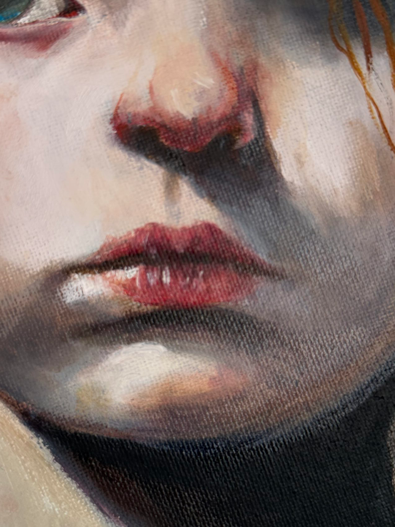 Her paintings are infused with warmth and emotion, featuring expressive faces, dynamic poses, and a subtle play of light and shadow. Symbols of motherhood, childhood, duality, and self-research reveal her inner resilience while inviting viewers into her personal journey. Rare plants, sacred motifs, and echoes of divine grace coexist with intimate self-portraits and solitary figures, bridging the everyday and the transcendent.