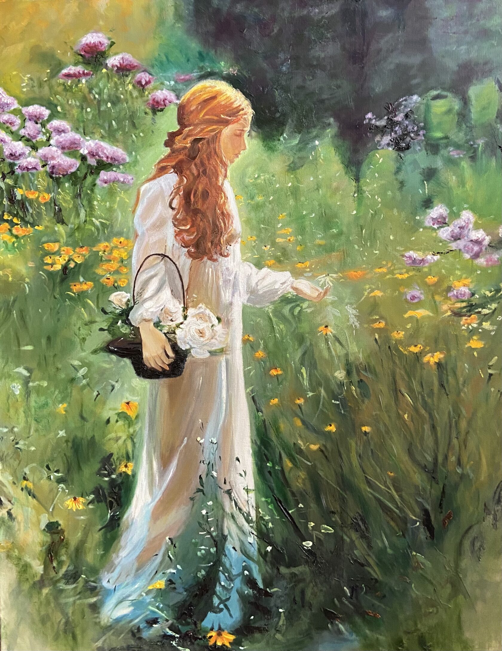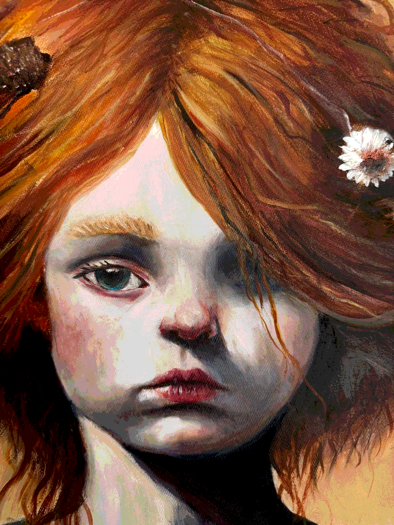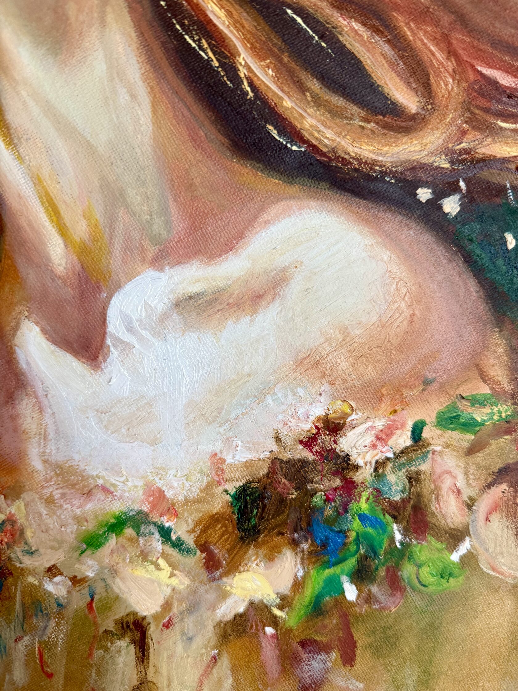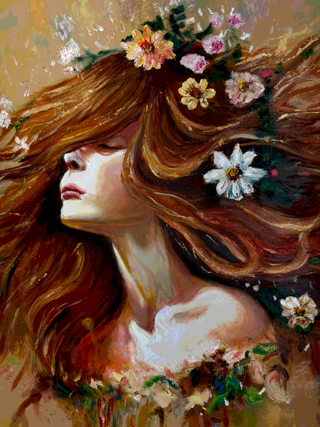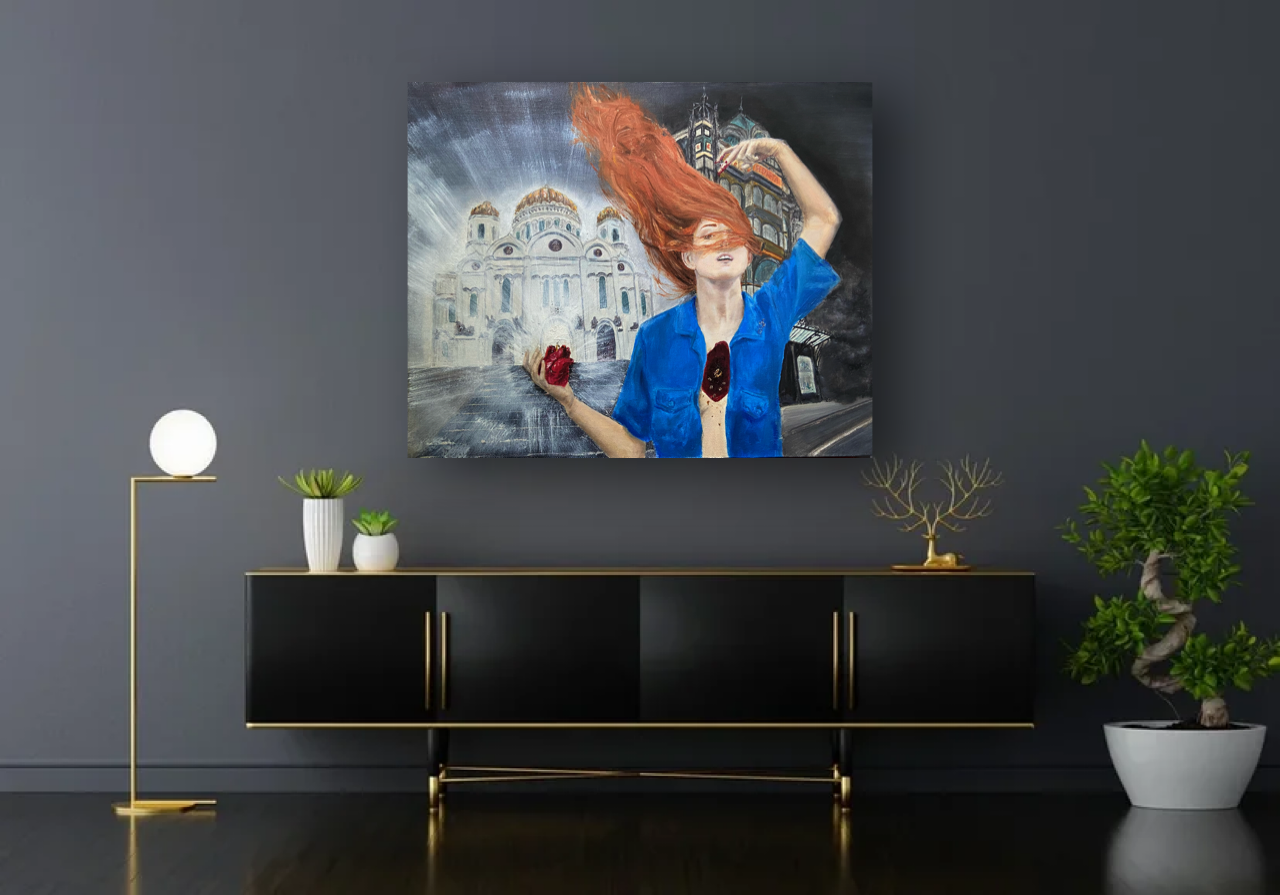 Her paintings are infused with warmth and emotion, featuring expressive faces, dynamic poses, and a subtle play of light and shadow. Symbols of motherhood, childhood, duality, and self-research reveal her inner resilience while inviting viewers into her personal journey. Rare plants, sacred motifs, and echoes of divine grace coexist with intimate self-portraits and solitary figures, bridging the everyday and the transcendent.