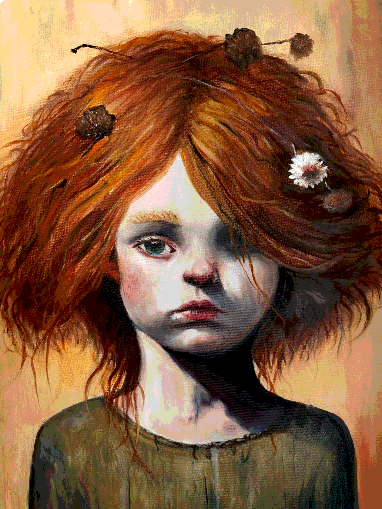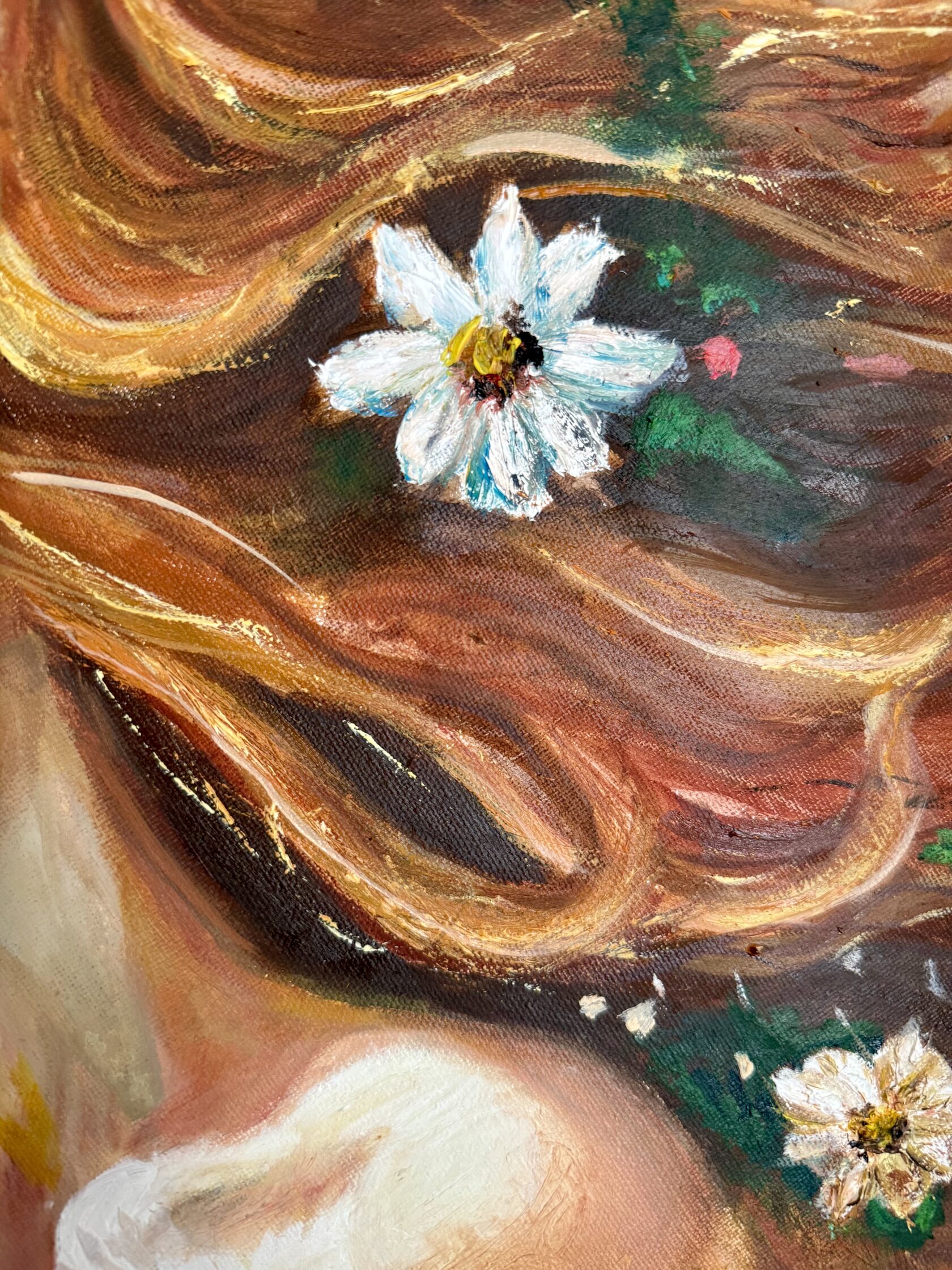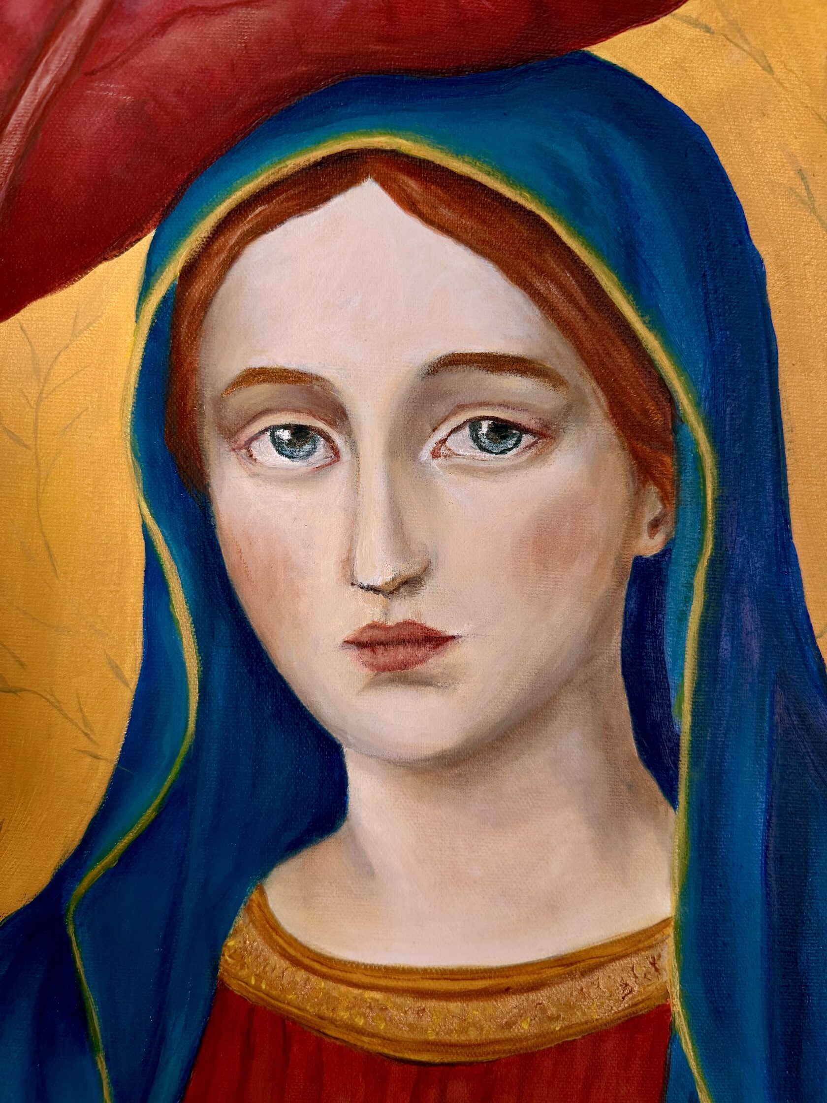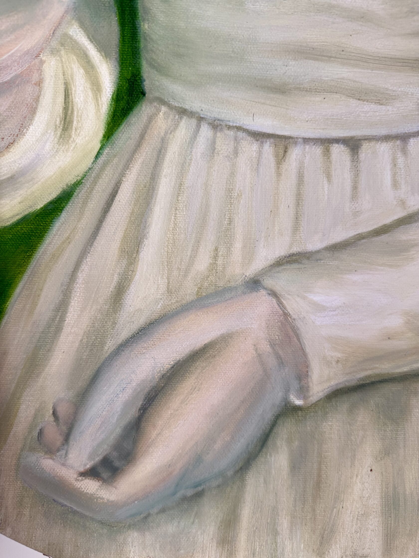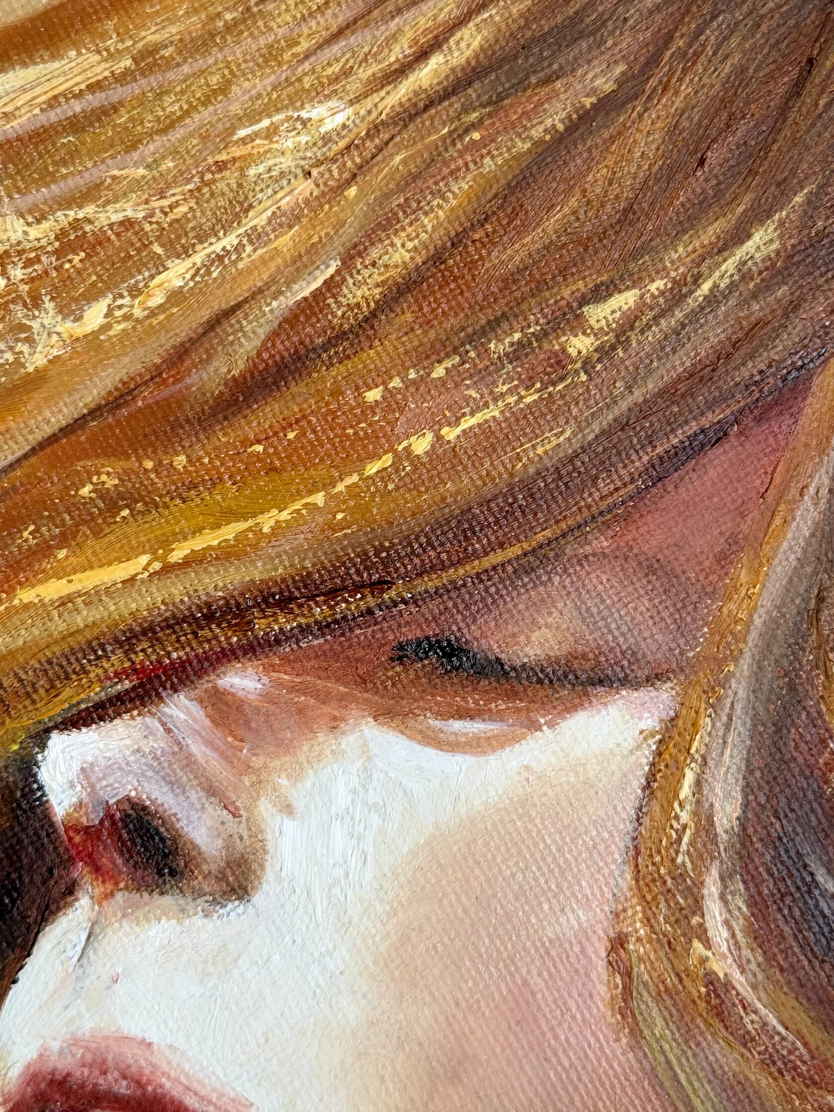 Her paintings are infused with warmth and emotion, featuring expressive faces, dynamic poses, and a subtle play of light and shadow. Symbols of motherhood, childhood, duality, and self-research reveal her inner resilience while inviting viewers into her personal journey. Rare plants, sacred motifs, and echoes of divine grace coexist with intimate self-portraits and solitary figures, bridging the everyday and the transcendent.