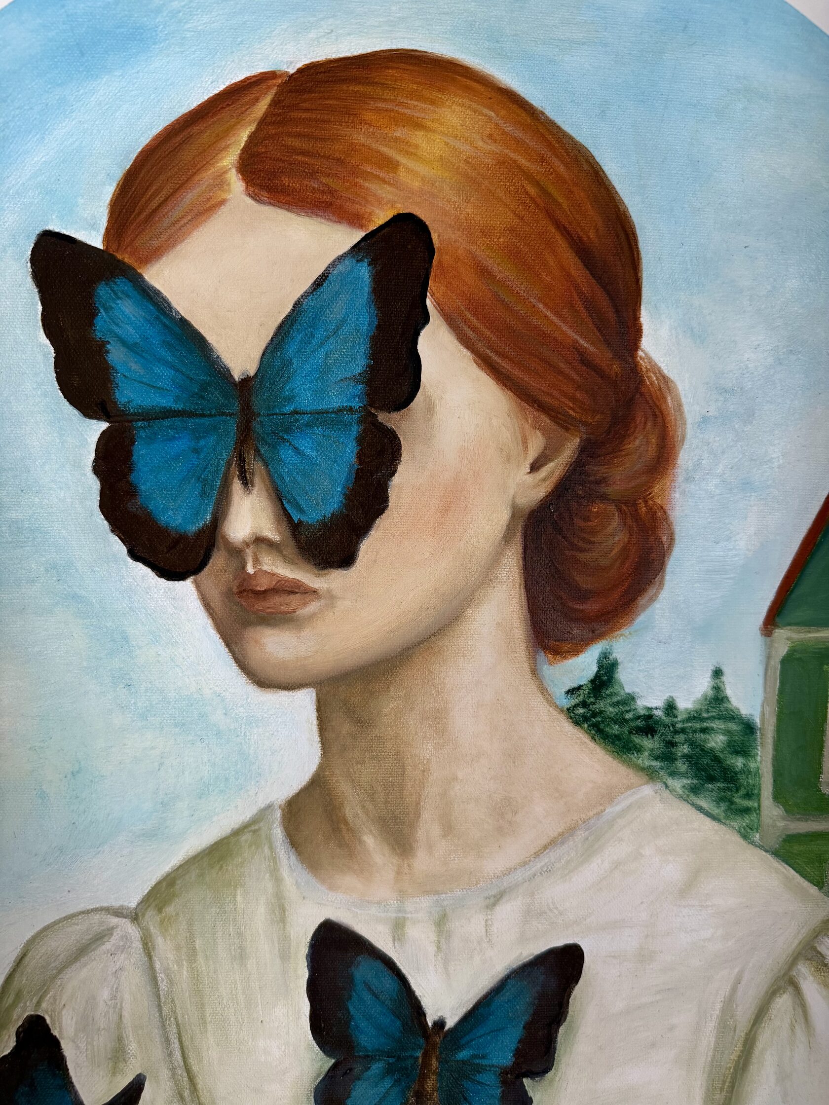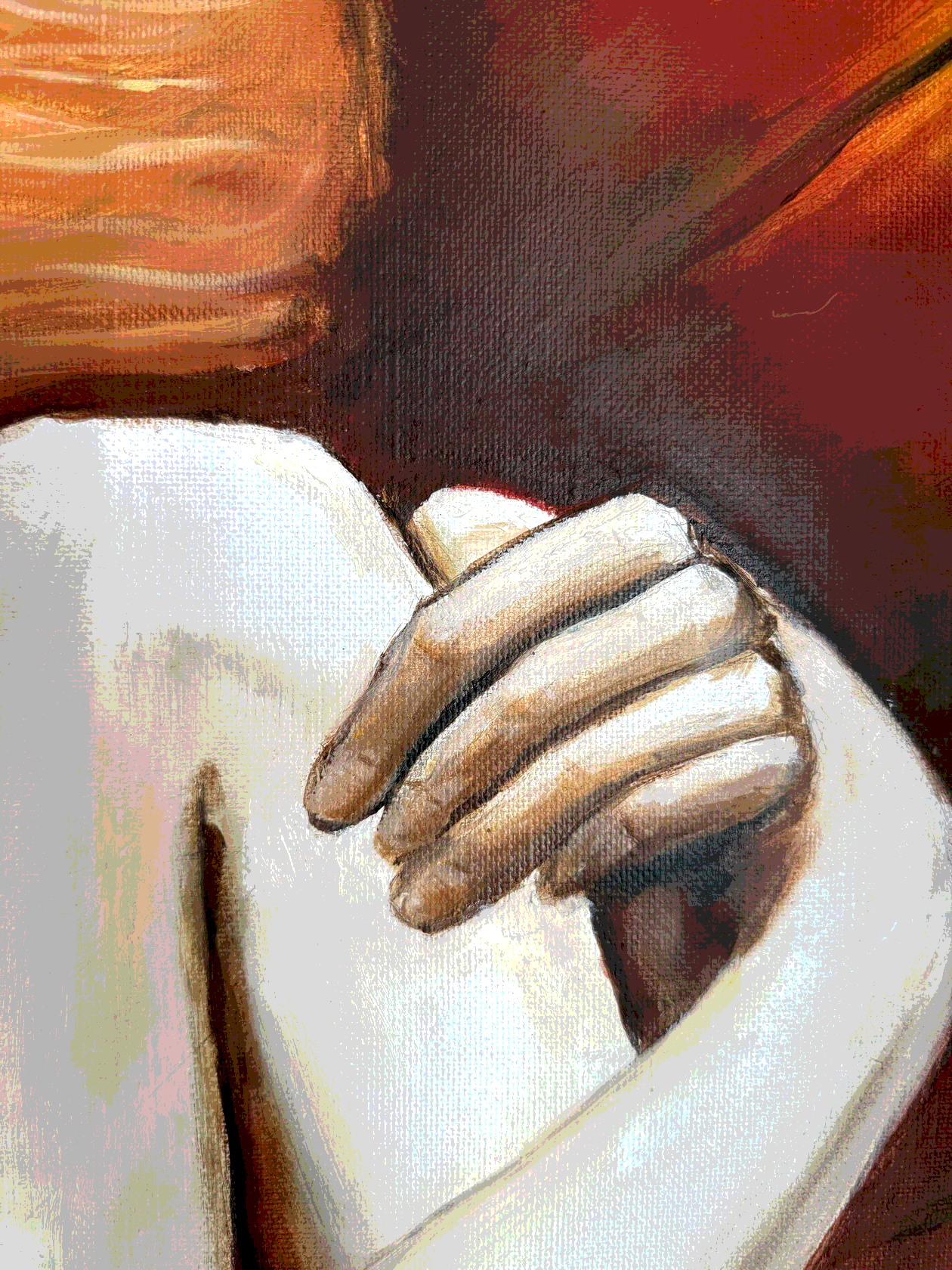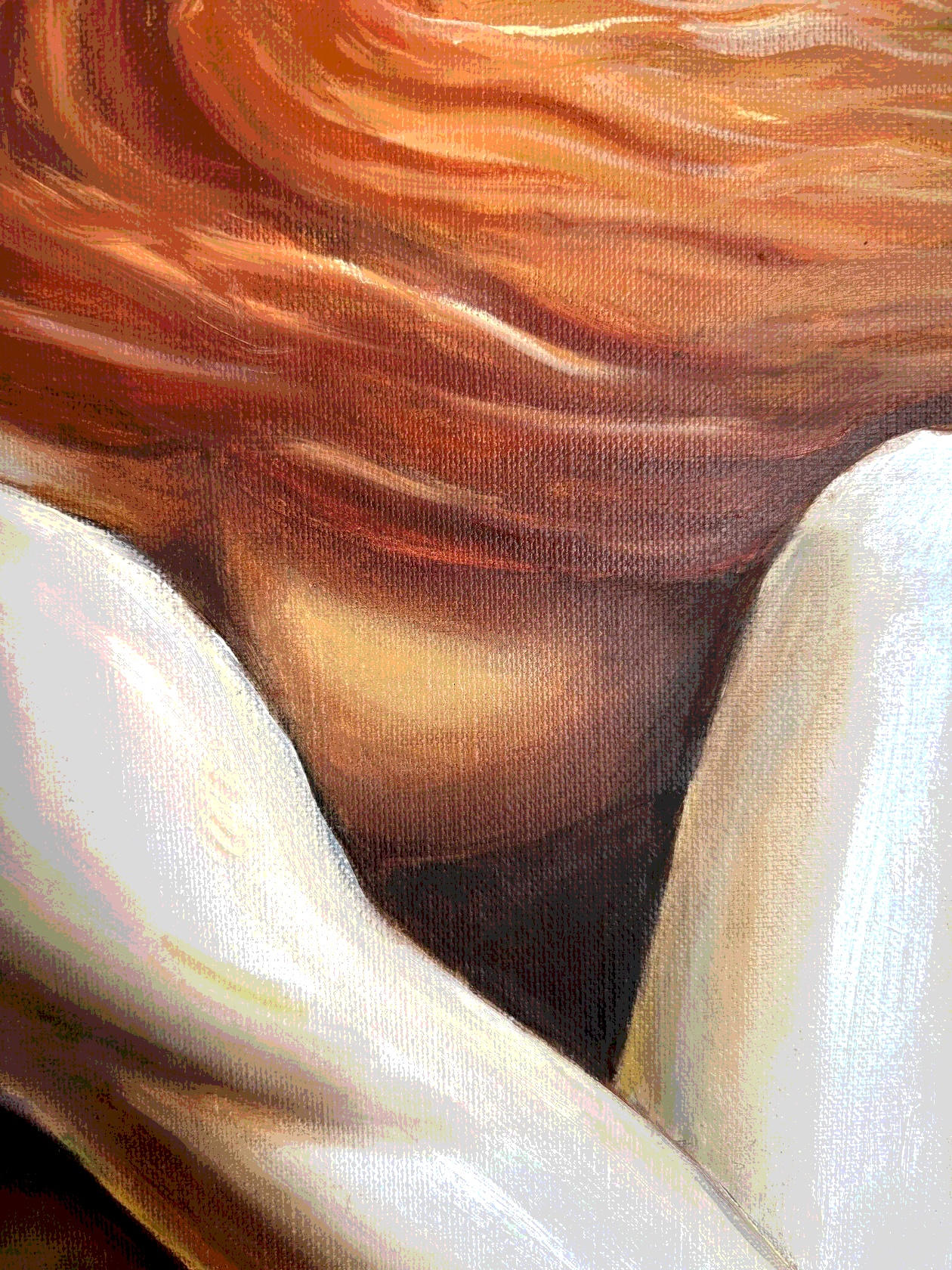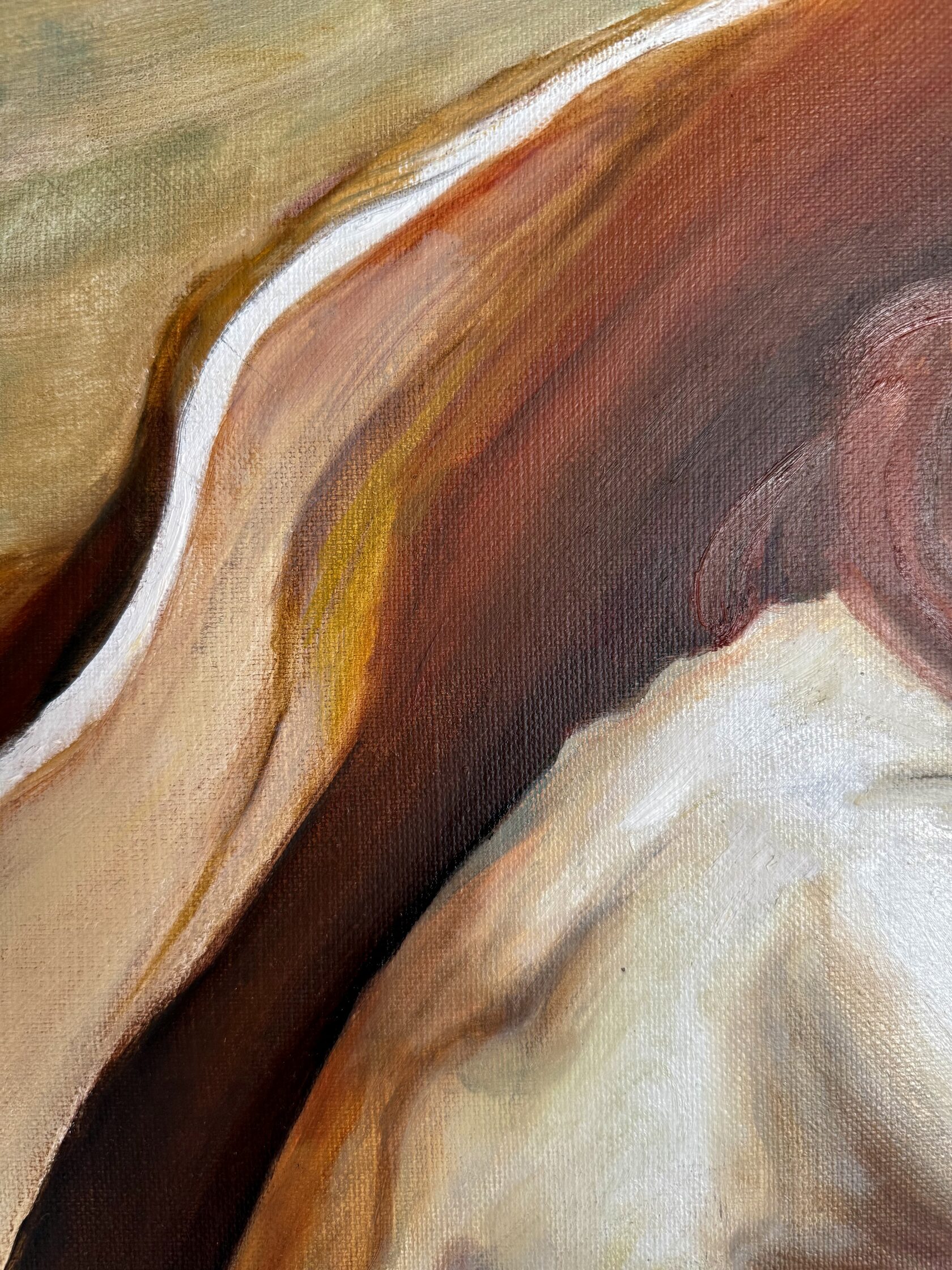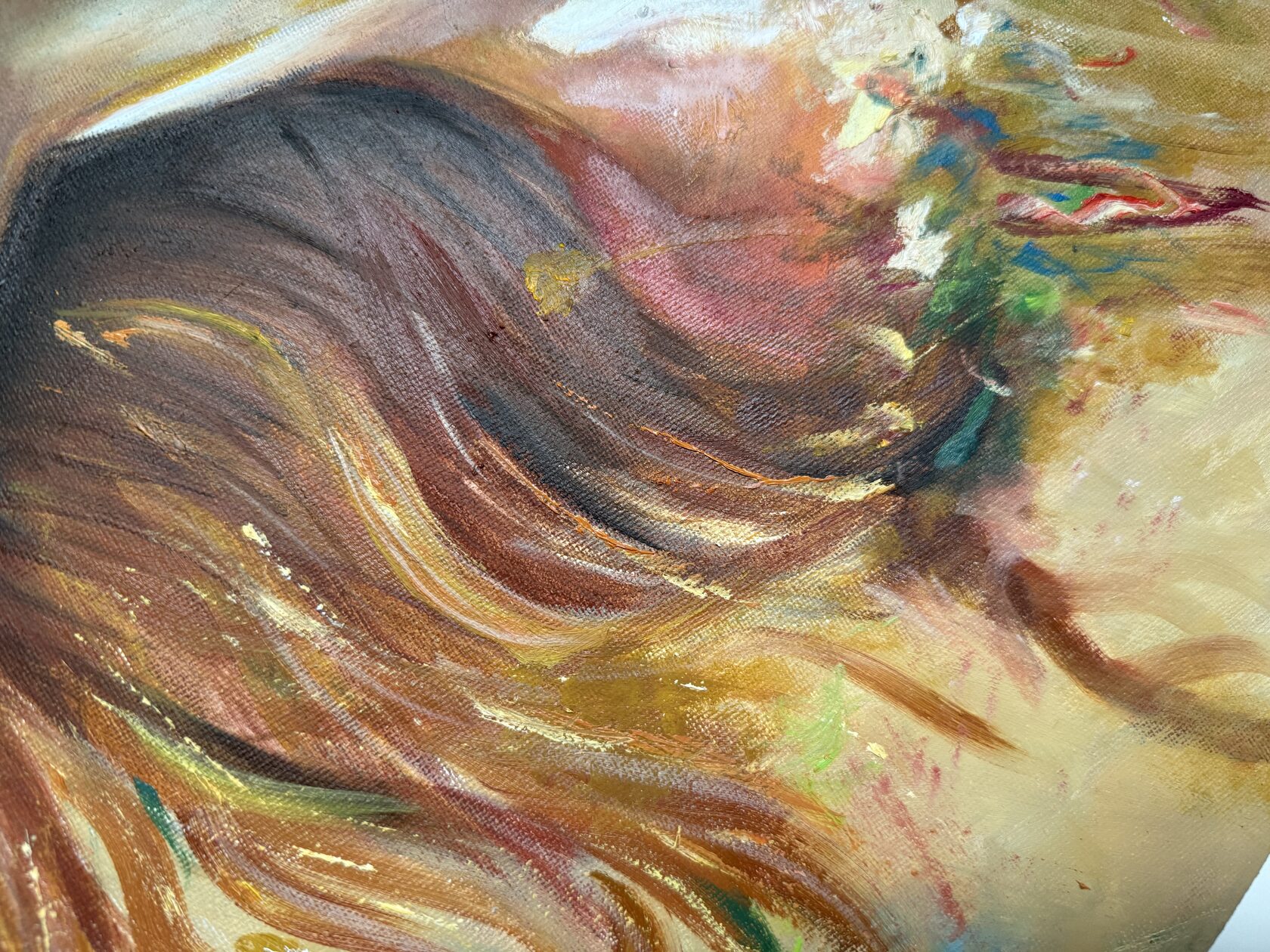 Her paintings are infused with warmth and emotion, featuring expressive faces, dynamic poses, and a subtle play of light and shadow. Symbols of motherhood, childhood, duality, and self-research reveal her inner resilience while inviting viewers into her personal journey. Rare plants, sacred motifs, and echoes of divine grace coexist with intimate self-portraits and solitary figures, bridging the everyday and the transcendent.