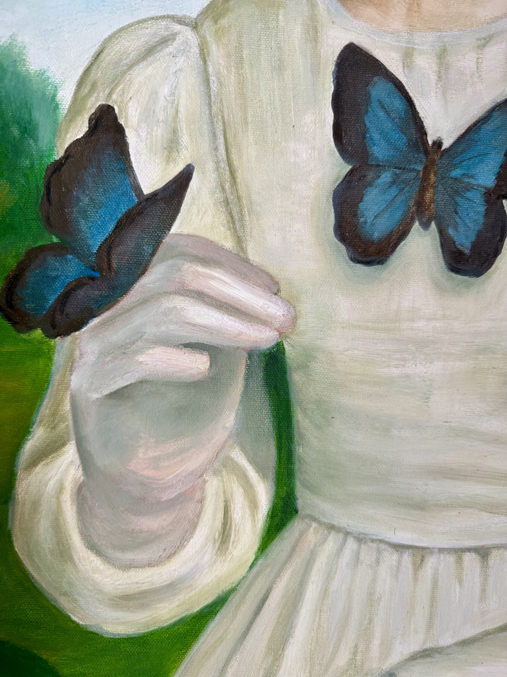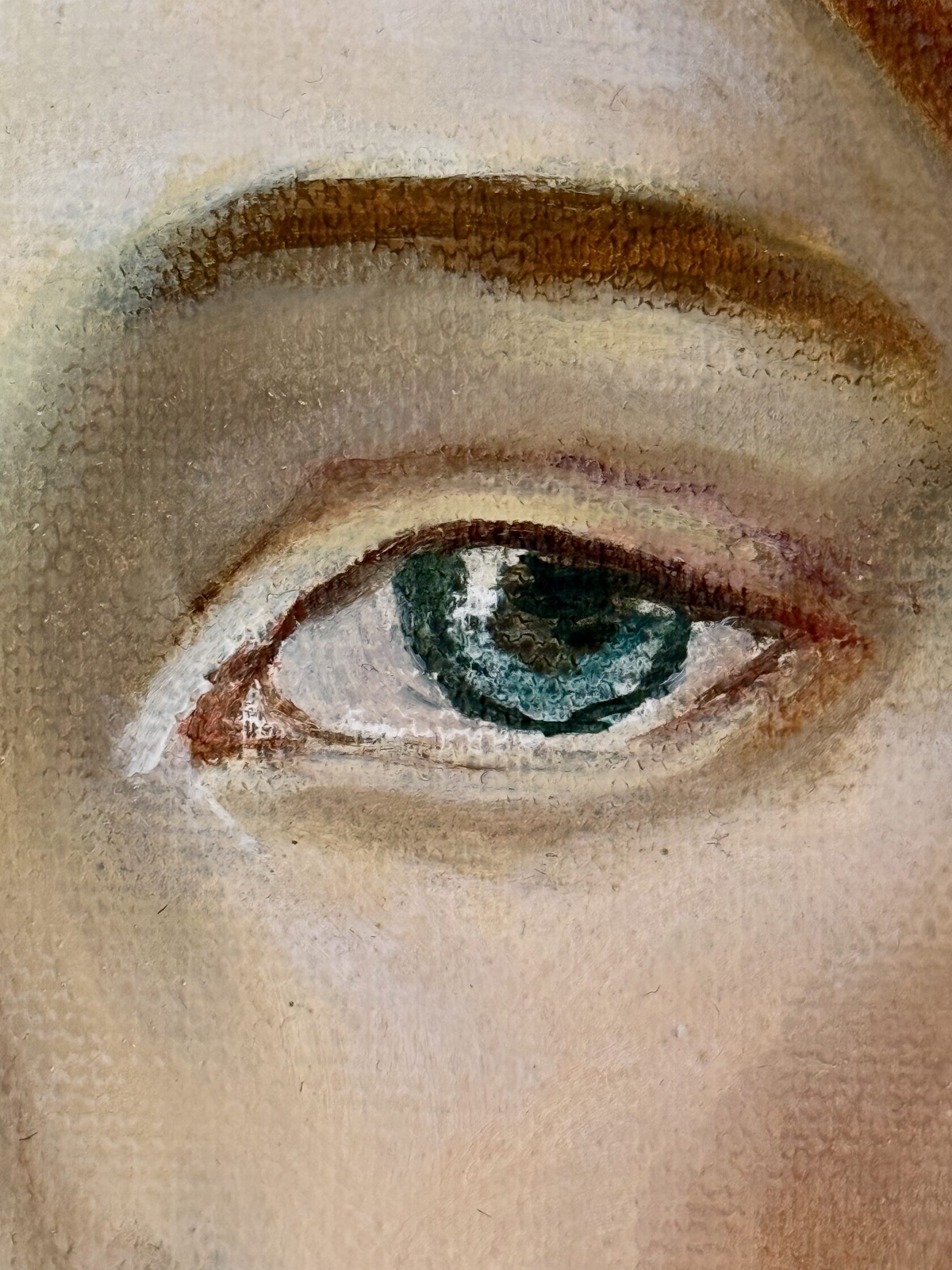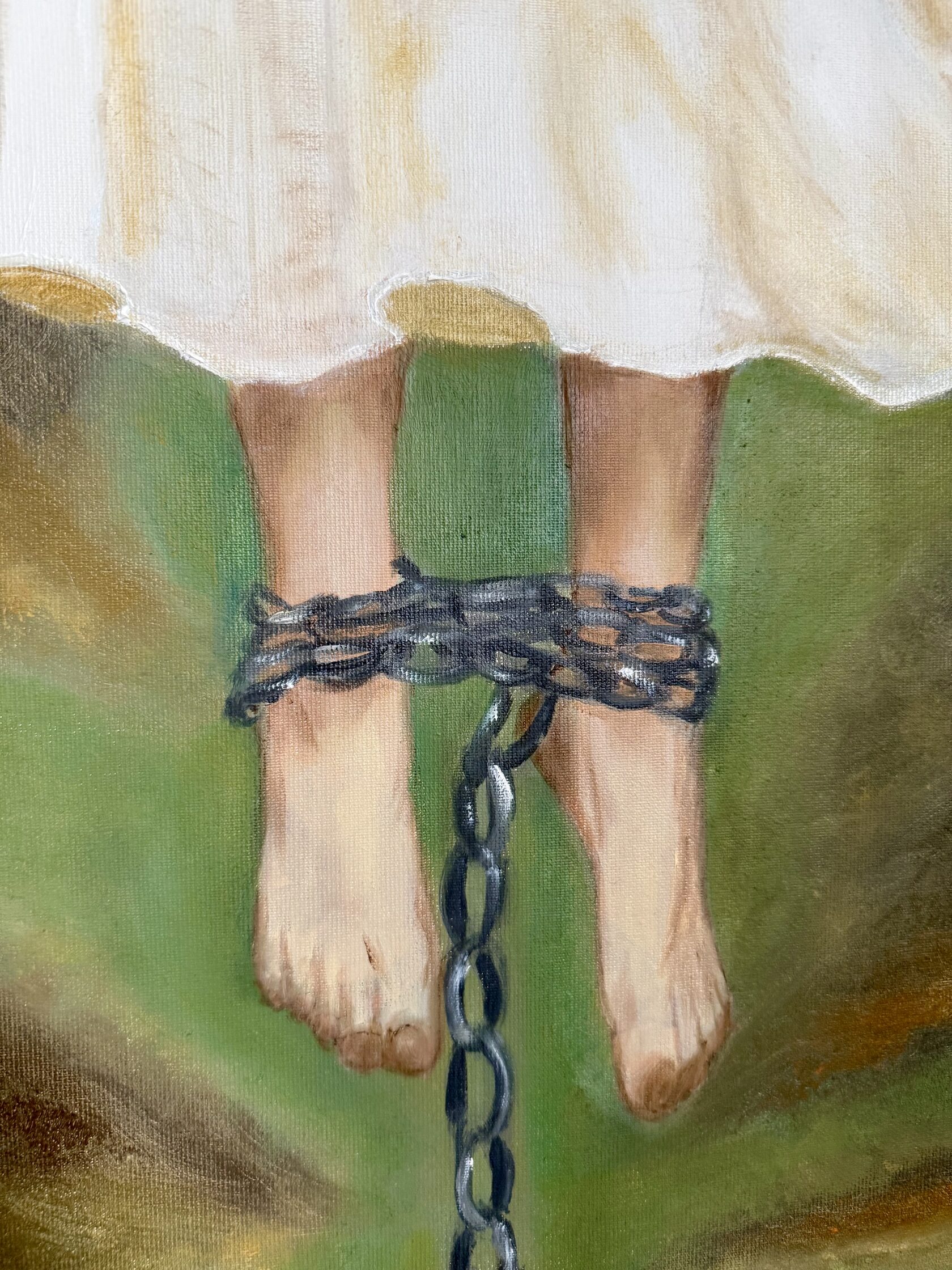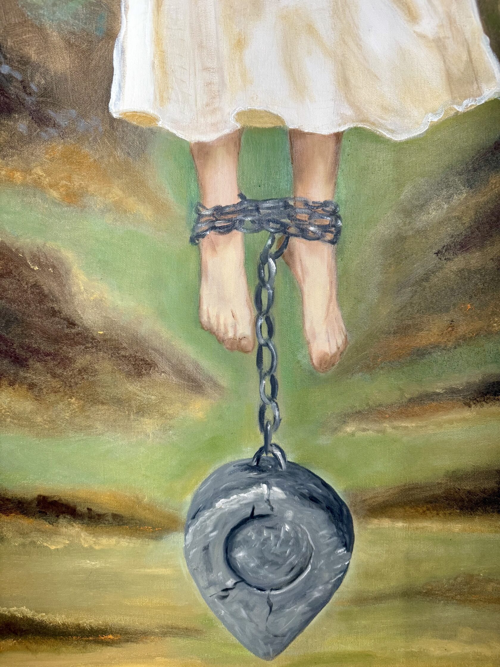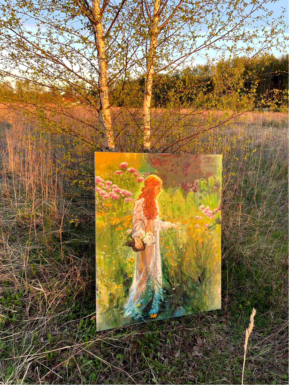 Her paintings are infused with warmth and emotion, featuring expressive faces, dynamic poses, and a subtle play of light and shadow. Symbols of motherhood, childhood, duality, and self-research reveal her inner resilience while inviting viewers into her personal journey. Rare plants, sacred motifs, and echoes of divine grace coexist with intimate self-portraits and solitary figures, bridging the everyday and the transcendent.