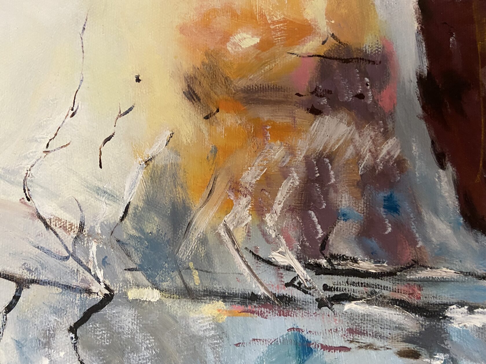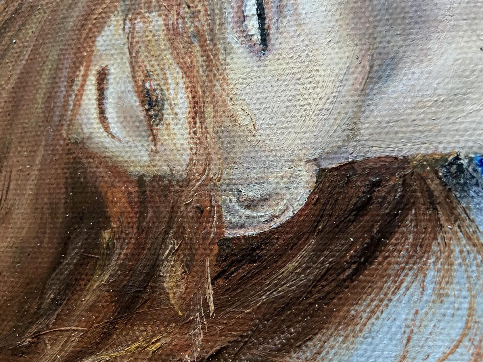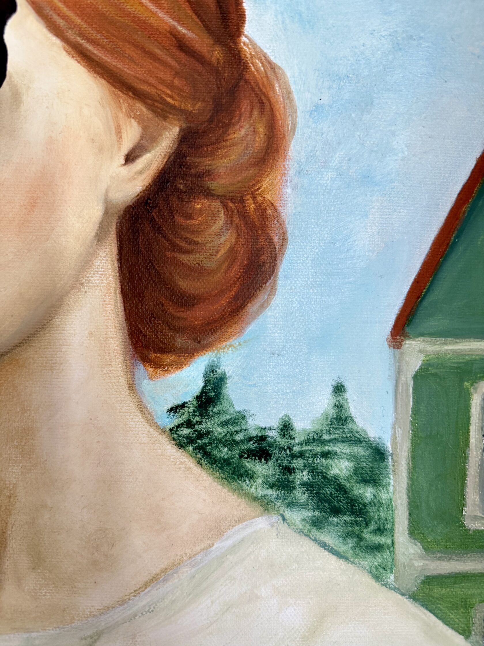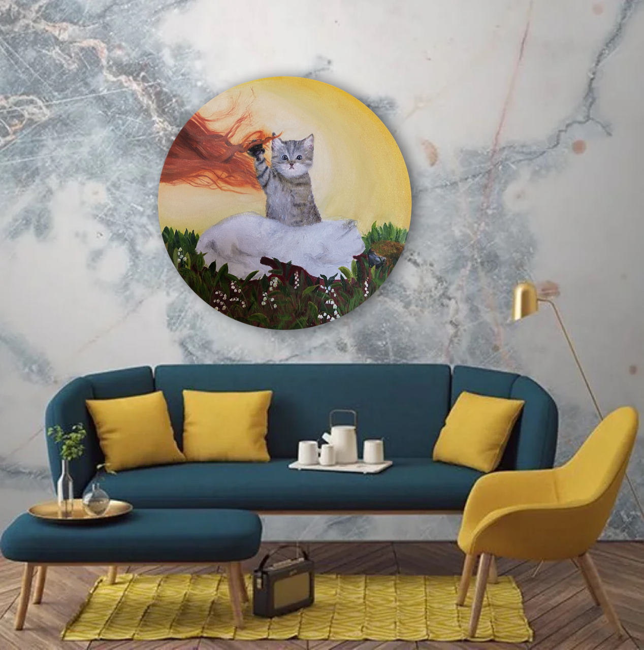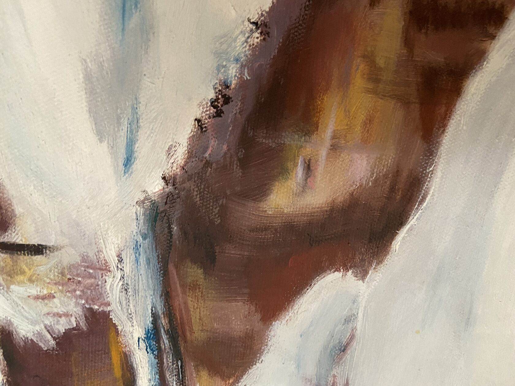 Her paintings are infused with warmth and emotion, featuring expressive faces, dynamic poses, and a subtle play of light and shadow. Symbols of motherhood, childhood, duality, and self-research reveal her inner resilience while inviting viewers into her personal journey. Rare plants, sacred motifs, and echoes of divine grace coexist with intimate self-portraits and solitary figures, bridging the everyday and the transcendent.