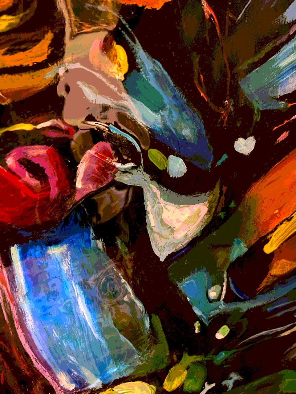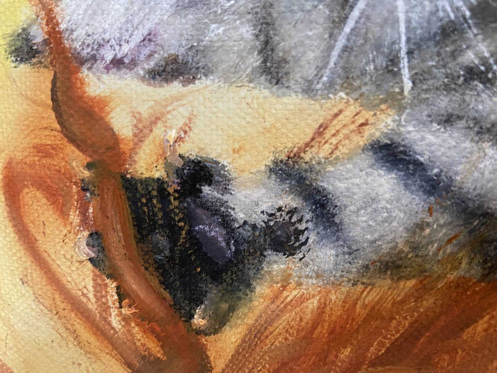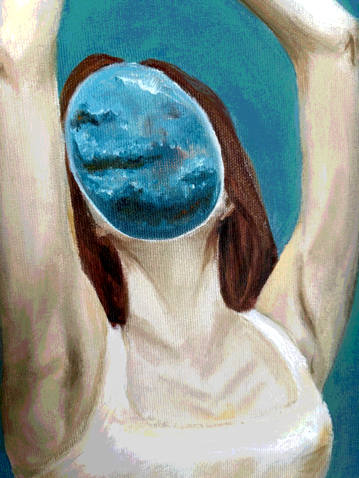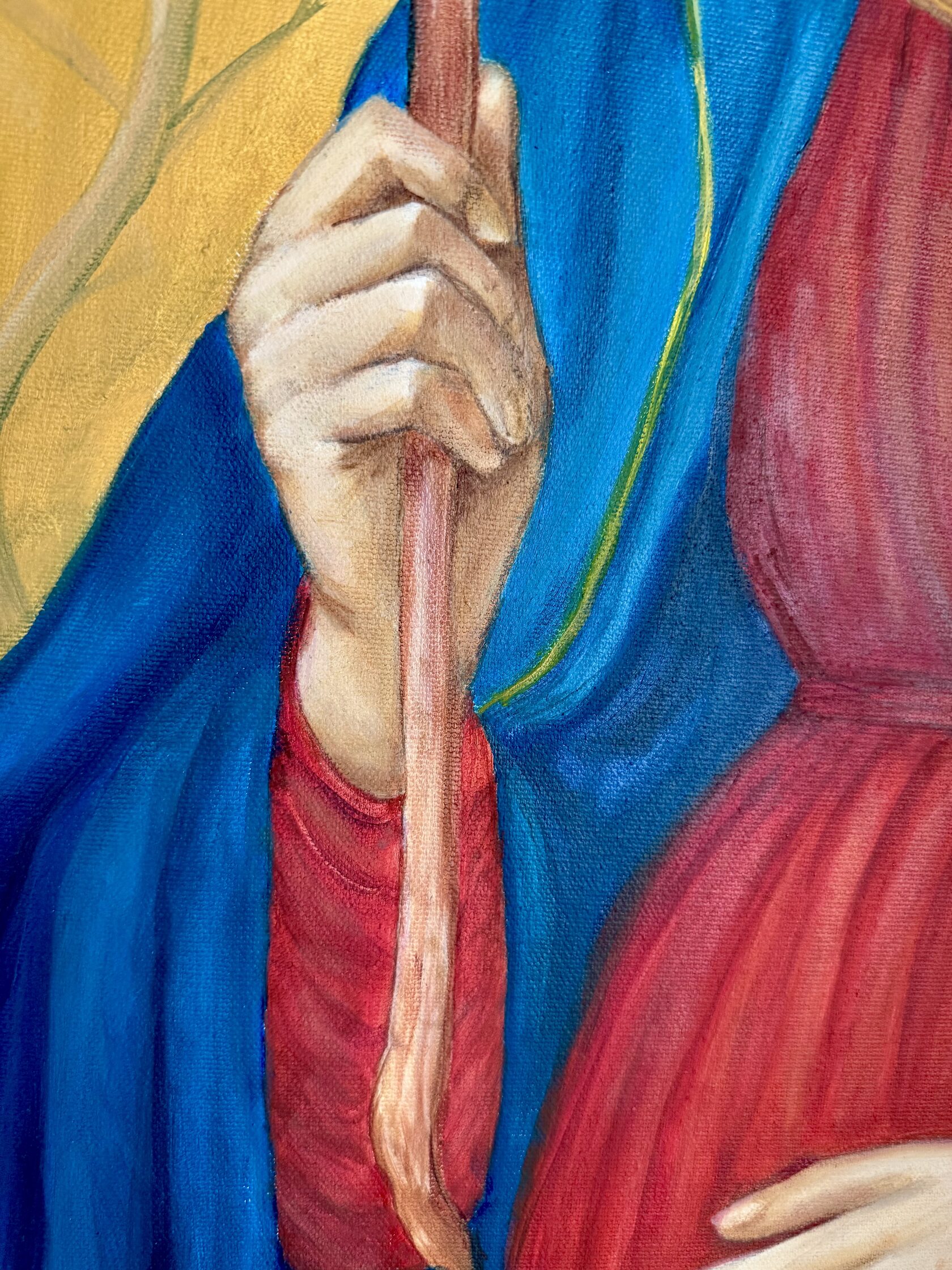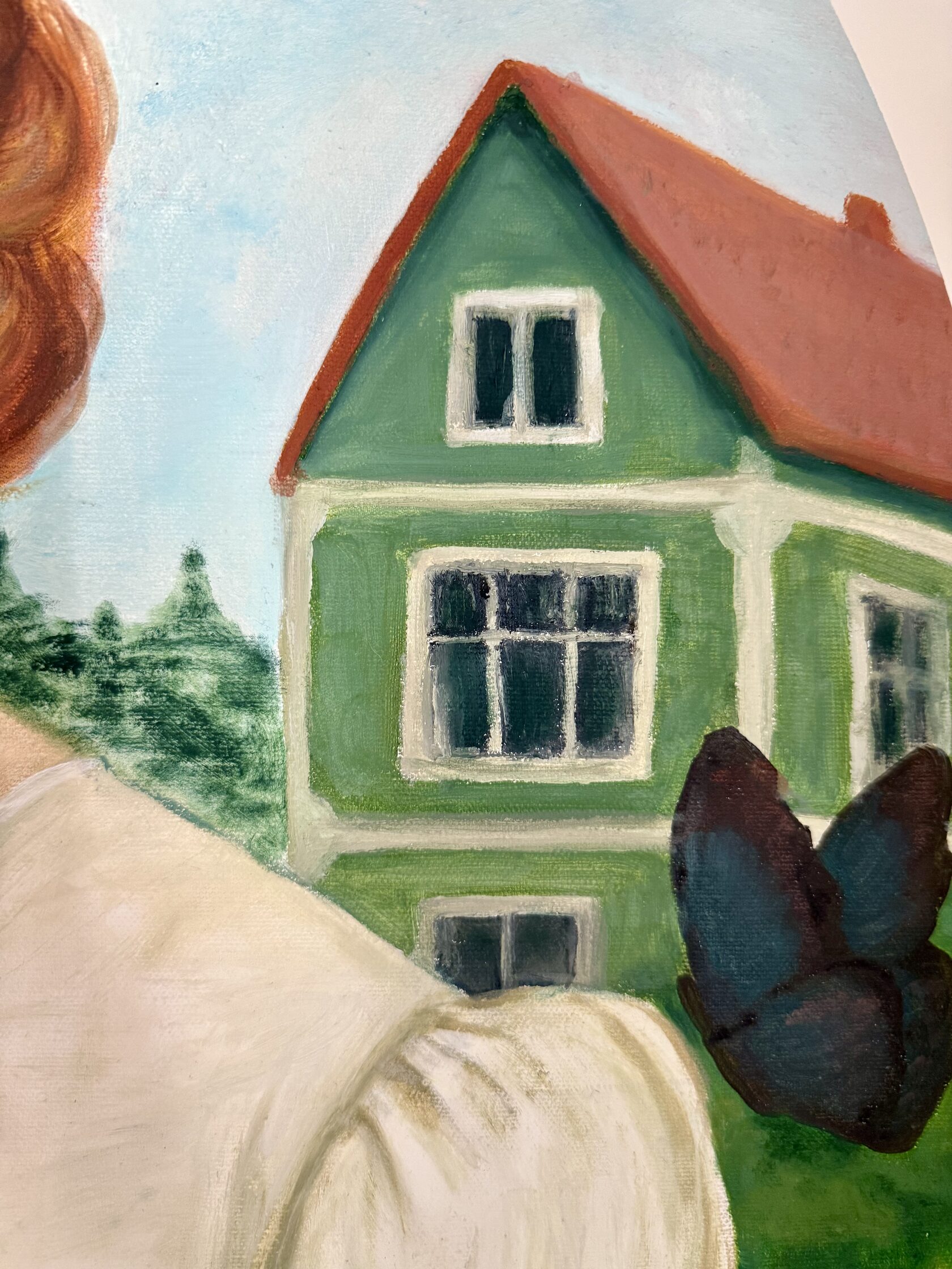 Her paintings are infused with warmth and emotion, featuring expressive faces, dynamic poses, and a subtle play of light and shadow. Symbols of motherhood, childhood, duality, and self-research reveal her inner resilience while inviting viewers into her personal journey. Rare plants, sacred motifs, and echoes of divine grace coexist with intimate self-portraits and solitary figures, bridging the everyday and the transcendent.